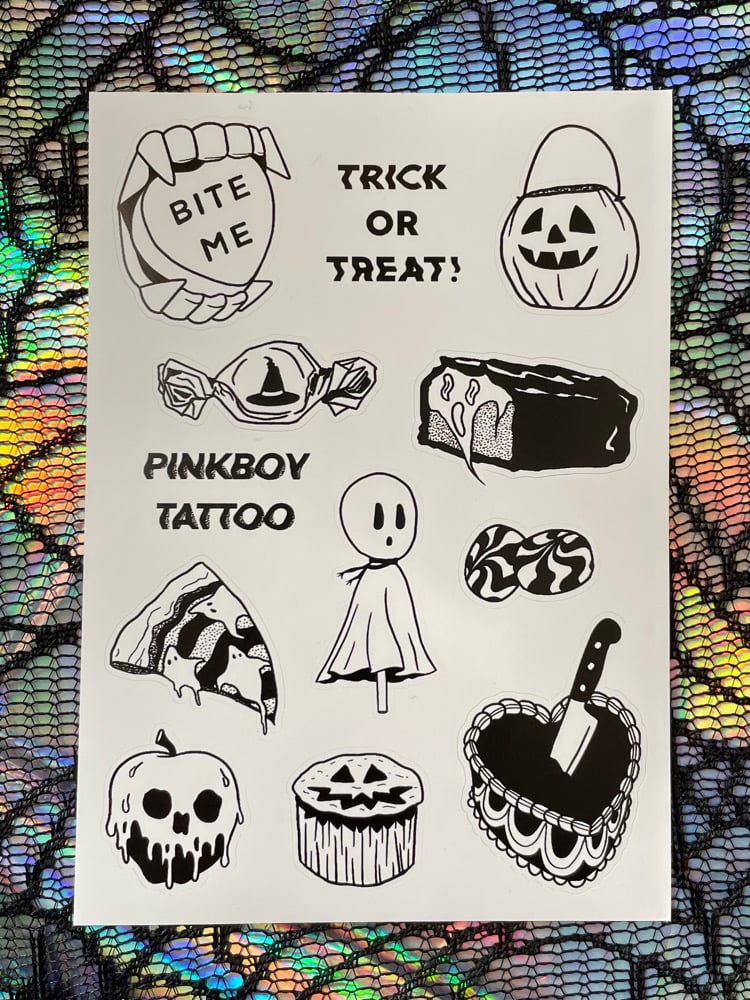 These A6 themed sticker sheets feature a collection of my Halloween tattoo flash designs!