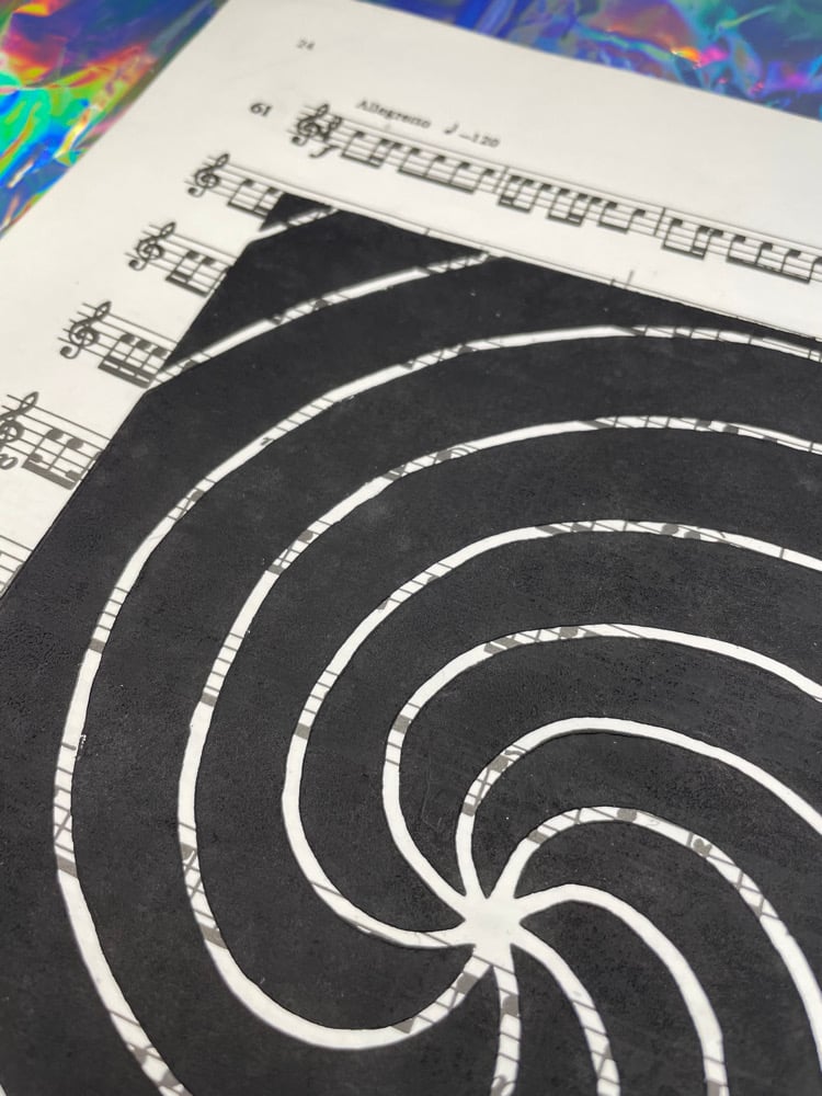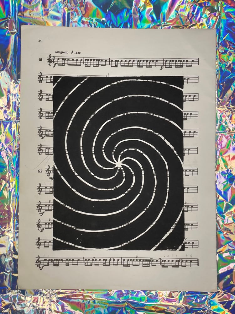 My original Swirl lino print, hand printed on a vintage piece of sheet music for snare drum.